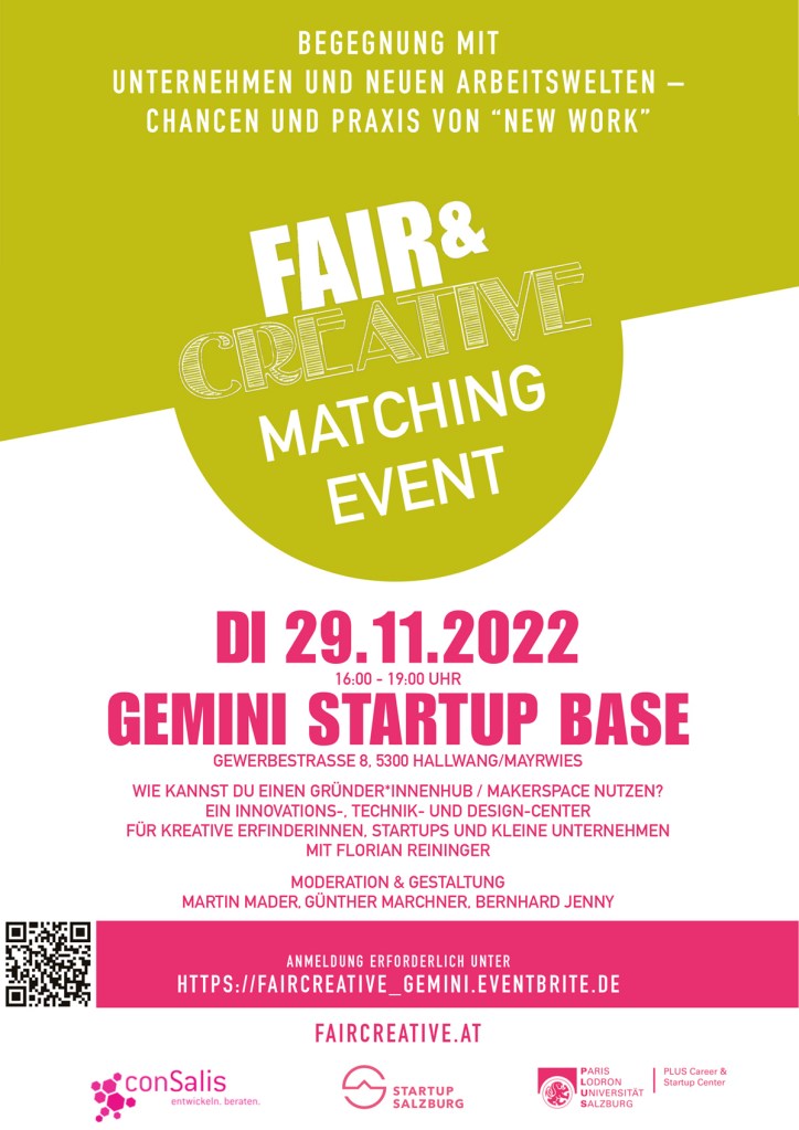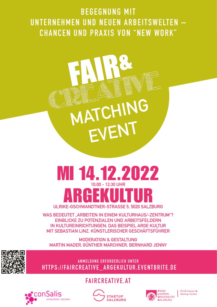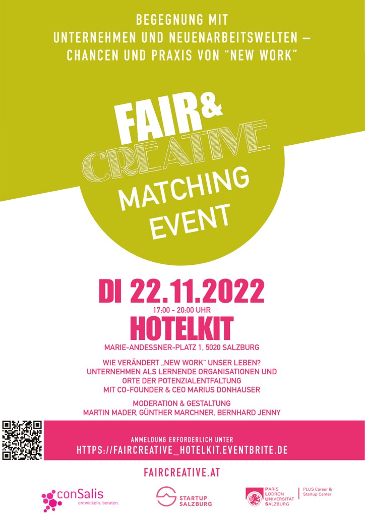 Sowohl als Lehrveranstaltung in Kooperation mit dem Career & Startup Center der Universität Salzburg, als auch als Eventangebot für Interessierte, die aktuelle Arbeitswelten und -realitäten kennenlernen und mit den Unternehmen in Kontakt kommen wollen bietet FAIR & CREATIVE auch im Sommersemester eine sehr diverse und spannende Reihe von Veranstaltungen.